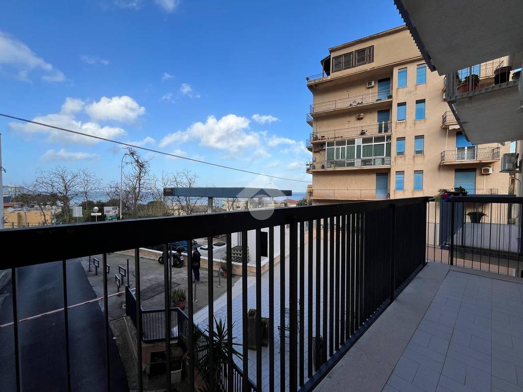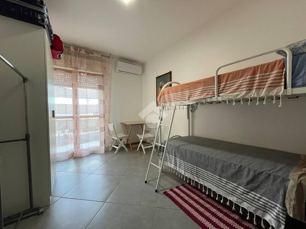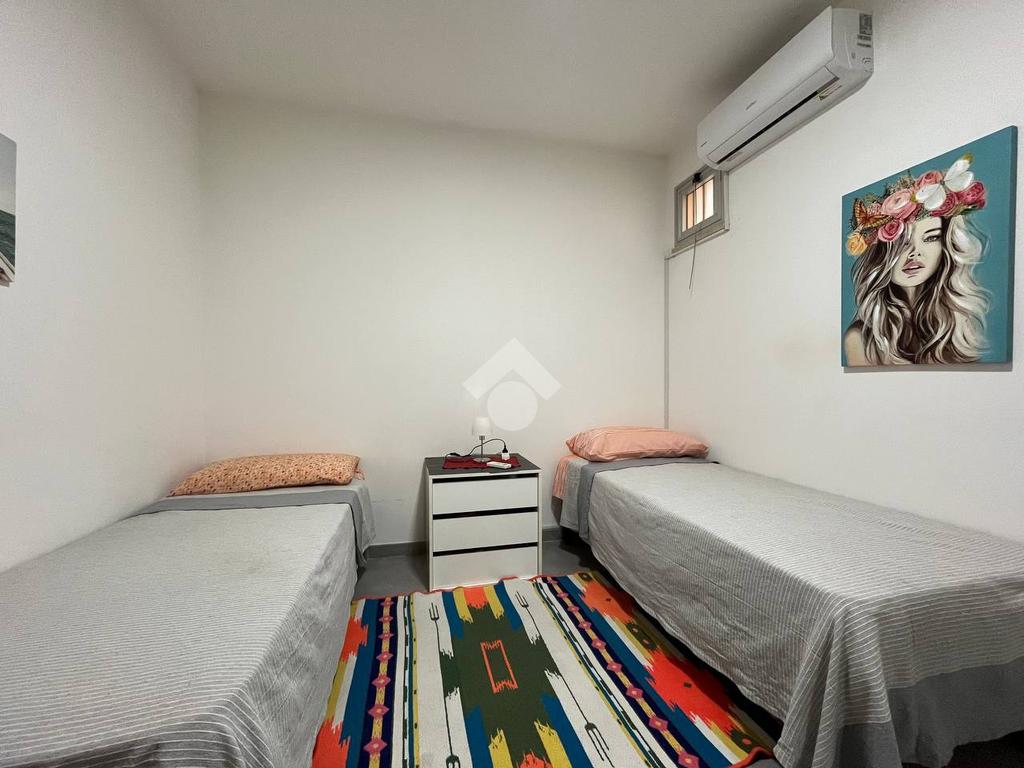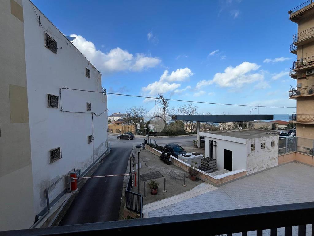 Situato al primo piano di un condominio, l'appartamento di 130 mq è composto da un ampio soggiorno, una cucina con balcone, due bagni e due camere da letto con balcone vista mare. L'appartamento include anche un posto auto interno assegnato.