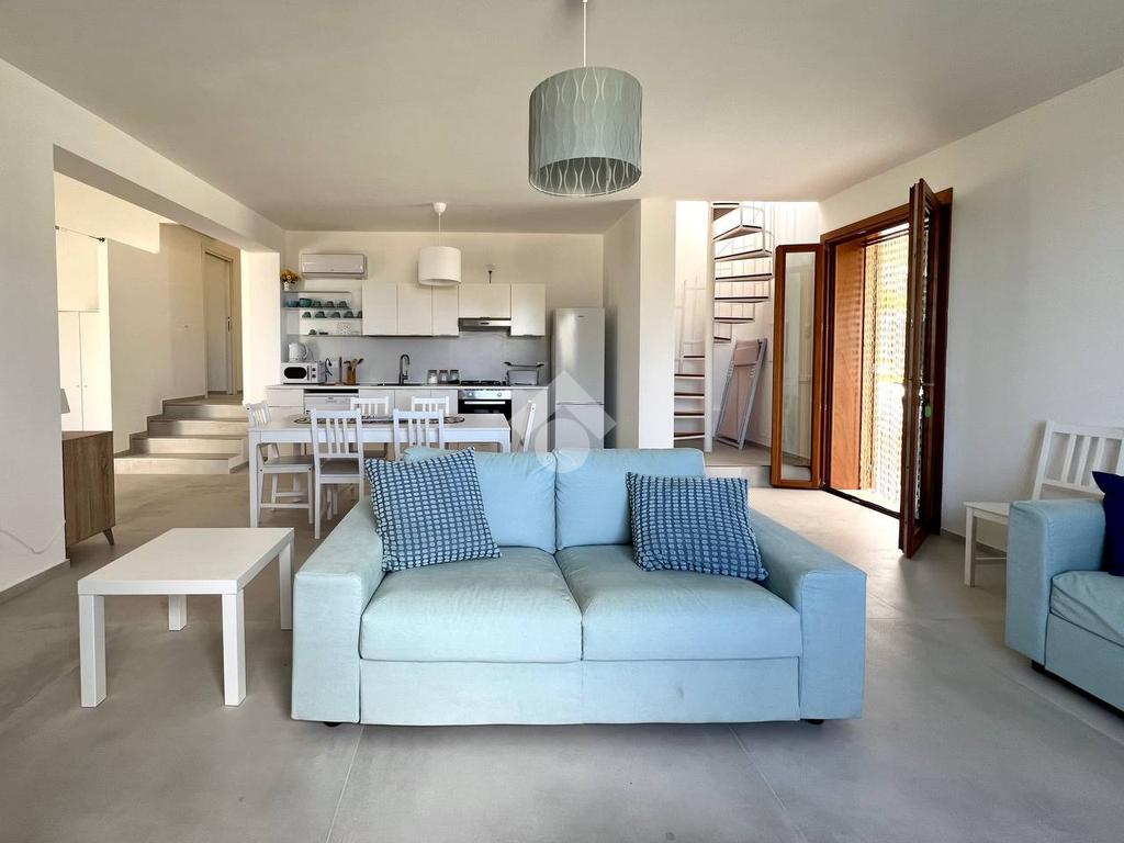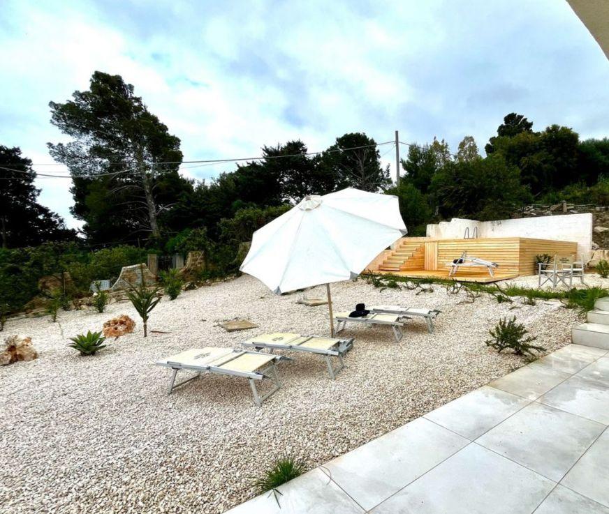 Una scala a chiocciola interna conduce al primo piano dove troviamo un terrazzo con angolo solarium e vista panoramica.