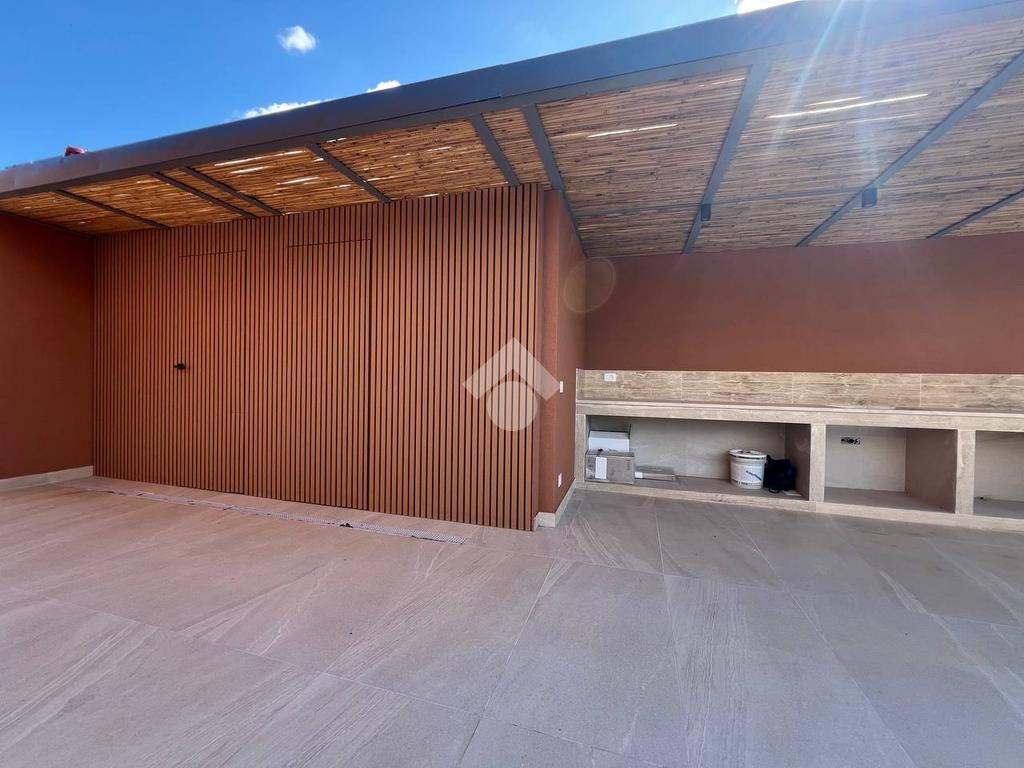 Lo spazio esterno privato è dotato di giardino di circa 250 mq con piante decorative, un'area barbecue, una piscina e un posto auto. Inoltre sul terrazzo è presente un tetto giardino di circa 30 mq.